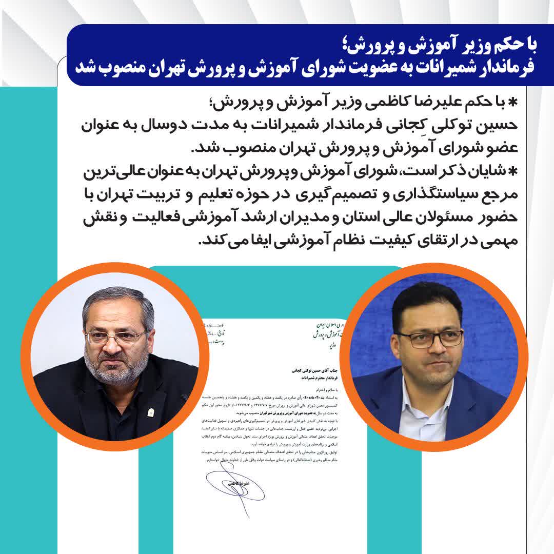 با حکم وزیر آموزش و پرورش؛ فرماندار شمیرانات به عضویت شورای آموزش و پرورش تهران منصوب شد